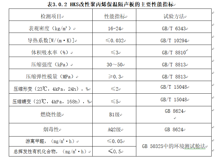 改性聚丙烯保溫隔聲板主要性能指標(biāo)